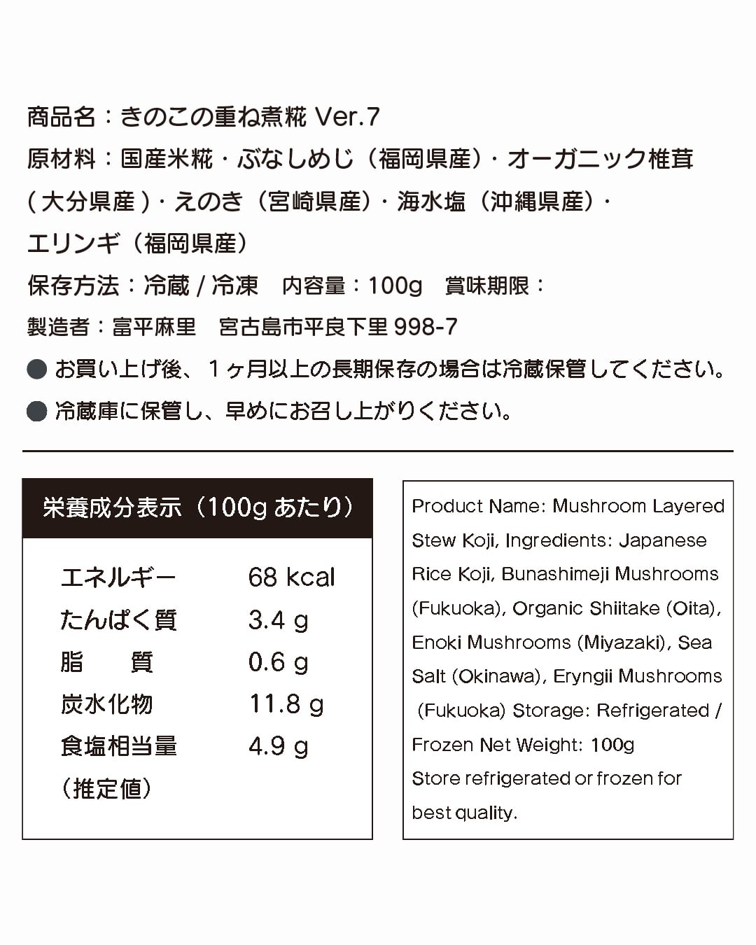 原材料:国産米糀・ぶなしめじ(福岡県産)・オーガニック椎茸